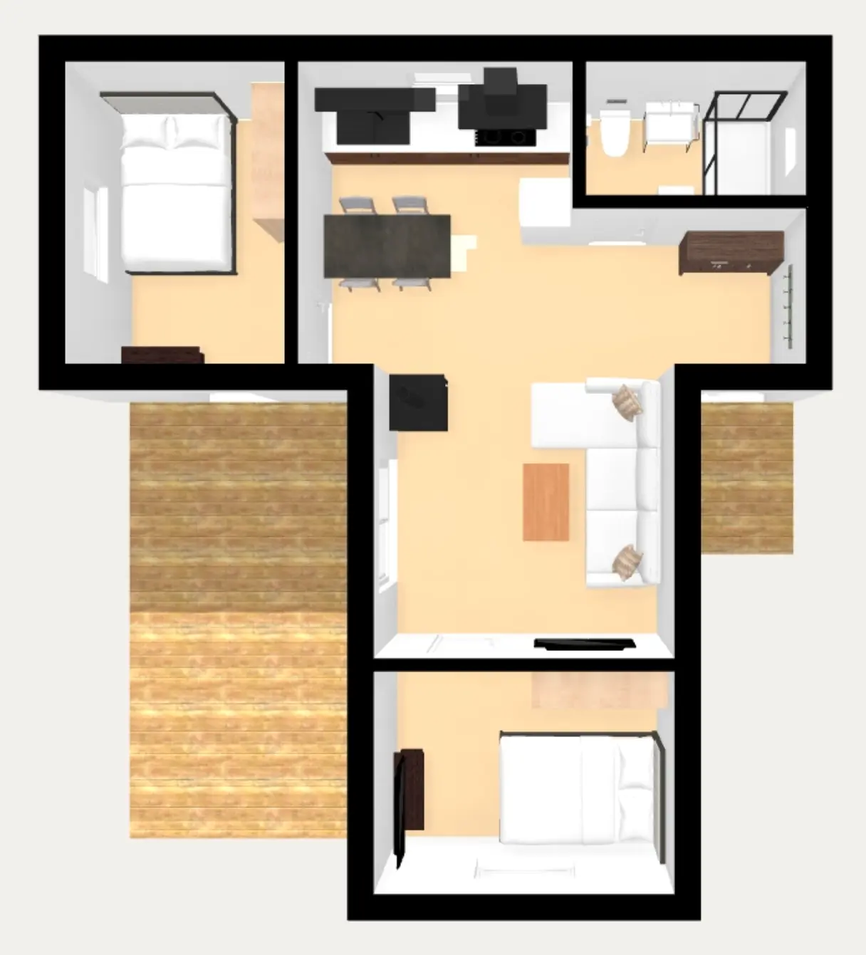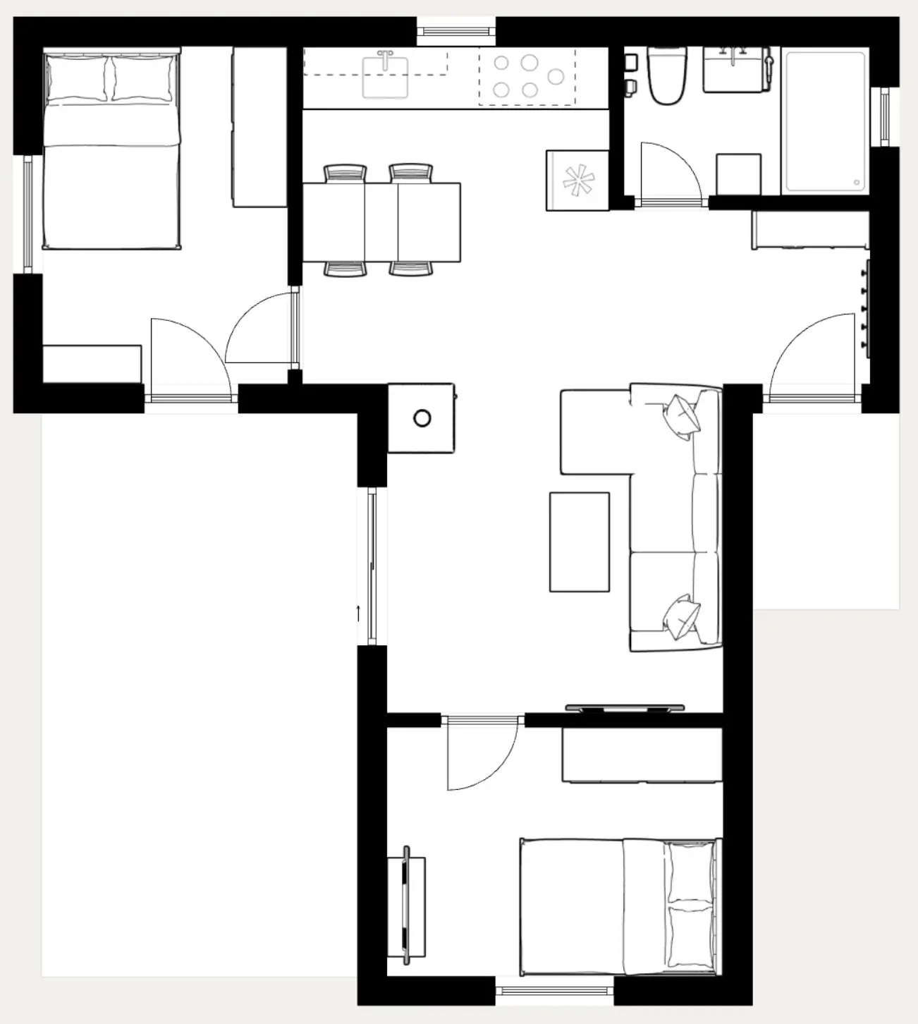 Model Flora ističe se svojom dinamičnom arhitekturom i prepoznatljivom lučnom nadstrešnicom koja vašu terasu pretvara u svijetli, natkriveni salon idealan za boravak u svim vremenskim uvjetima. Njezin pametan tlocrt od 60m2 u obliku slova T strateški razdvaja spavaće sobe na suprotne krajeve kuće ("split-bedroom"), osiguravajući ukućanima maksimalnu privatnost i mir. ​Središnji open-space prostor s visokim stropom i velikim staklenim stijenama briše granice prema vrtu, čineći interijer prostranim i okupanim suncem. Iza razigranog krova krije se ozbiljna snaga našeg STIROTON sustava, koji jamči A+ energetsku učinkovitost i vrhunsku izolaciju. Flora je savršen izbor za one koji traže funkcionalnost s modernim vizualnim potpisom.